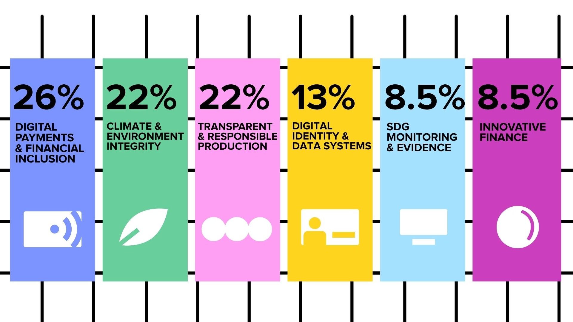 Digital payments and financial inclusion account for the largest share of solutions, followed by climate finance and environmental integrity, and transparent and responsible production. Together, these clusters make up the majority of the portfolio, pointing to areas where systems rely on trust, coordination, and shared data across multiple actors – and where existing approaches often struggle with fragmentation and limited transparency.