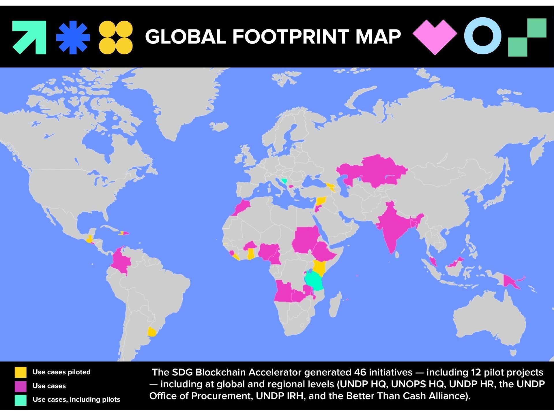 This report highlights the geographic spread and diversity of blockchain applications across development contexts. Across it, blockchain is increasingly used as a coordination and trust layer – supporting how data, payments, and decisions move across systems in more transparent and verifiable ways.